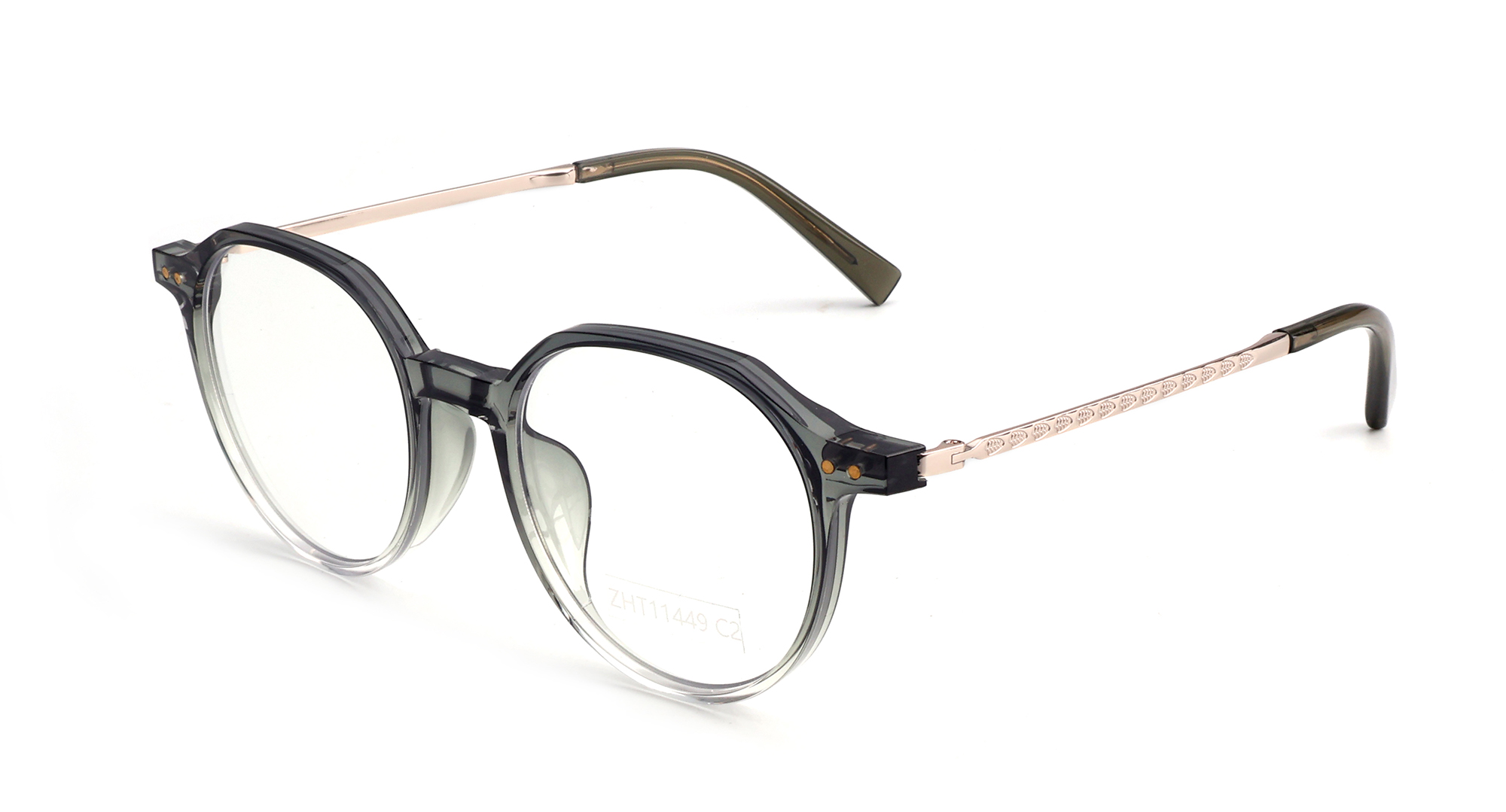The intricate leaf-patterned metalwork on the arms adds a premium, artistic touch to these optical frames, making them a standout choice for fashion-conscious users. Designed for long-wearing comfort, the ZHT11449 is suitable for both prescription lenses and blue-light blocking lenses. We offer full OEM & ODM services to customize colors and logos, ensuring these round eyeglasses align perfectly with your brand’s aesthetic.